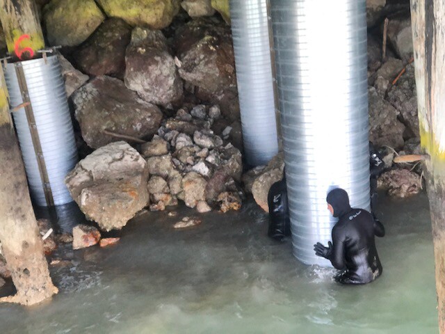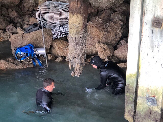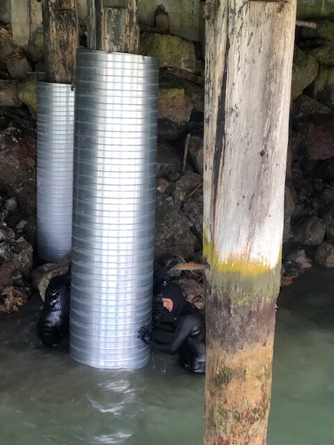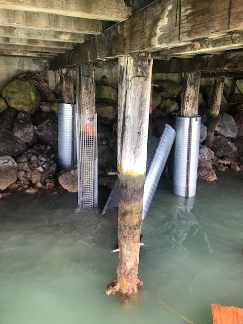 Our team are working in the South Island on a pile refurbishment project again. These lovely old wharves have been around for many many years and would have a tale or two to tell if they could! However the harsh marine environment is taking its toll on these structures and it is time for a refurbishment. Our team are casing the piles (including mesh) and then pouring concrete into the casing. This is giving the tired old piles a new lease of life and will allow them to continue to hold up the wharf for some time yet. Our team are also looking at completing some 'top side' work on the decking of the wharf - it is great that our team has such a wide range of skills that they can work over, under and in the water!