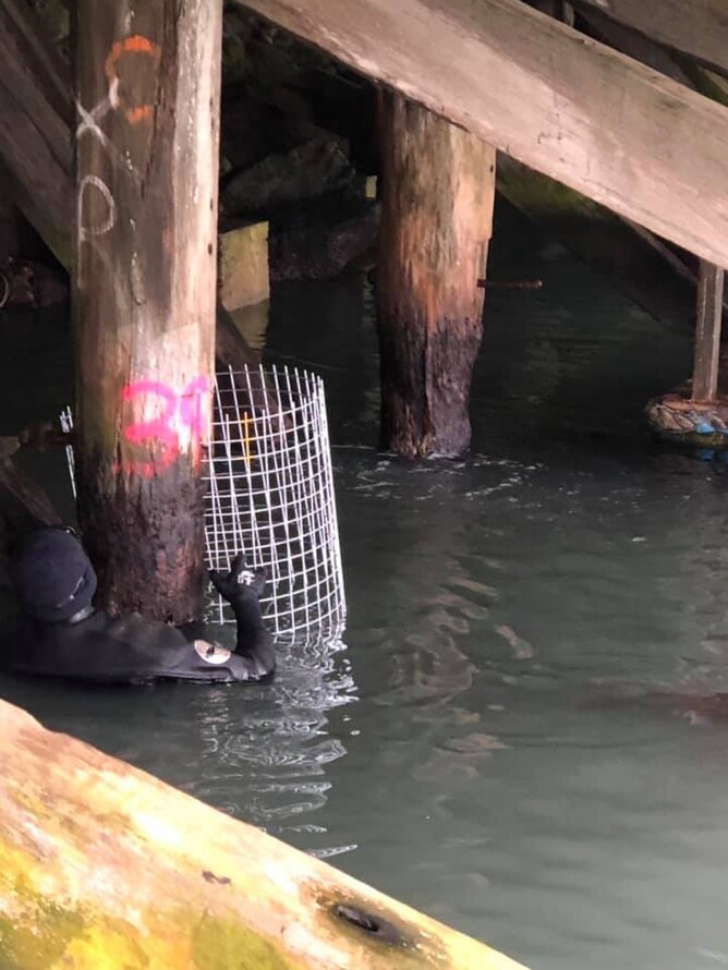 Work on the Historic Holmes wharf continues as our dive team place mesh and then casings around the 80 severely deteriorated piles and fill the casings with concrete to re-strengthen the piles. This along with replacement of some of the topside decking (also done by our team) will go a long way in ensuring this local icon remains usable for the people of Oamaru. The historic wharf is under the control of the Waitaki District Council and was first constructed in 1907 so is a local identity. The wharf is used by both pedestrians and fishing vessels and is still a large part of the Oamaru community.